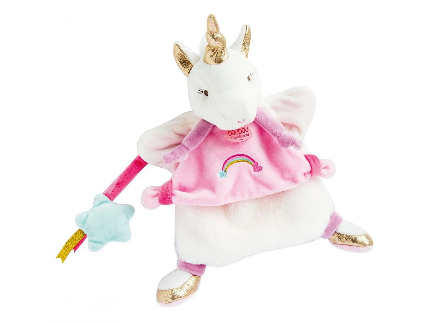 Une jolie marionnette Licorne, féerique pour imaginer de douces histoires à paillettes et faire briller les yeux de toutes les petites princesses. Créée dans des matières très douces blanches et roses, elle est adorable avec ses touches de glitter or. Idéale dès la naissance. Lavable à 30°. Taille 25cm.