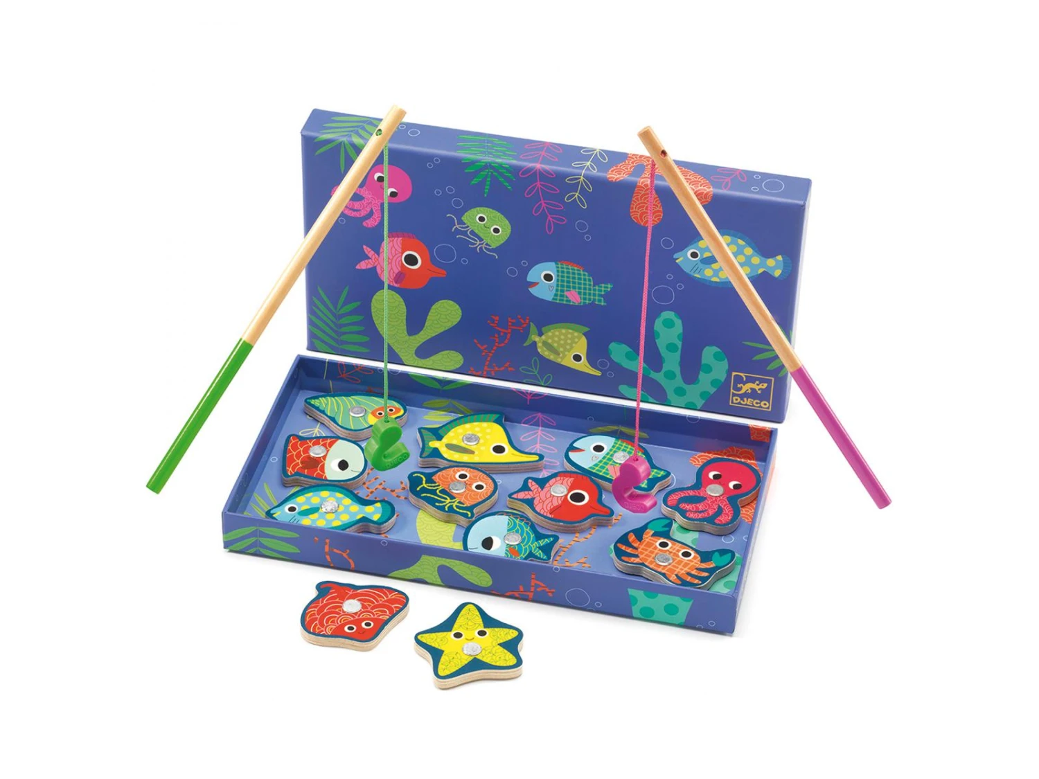 Prêts pour une partie de pêche ? Des animaux de la mer en bois, 2 cannes à pêche et une jolie boîte qui se transforme en fond marin. L’enfant attrape les pièces en bois aimantées à l’aide de la canne. La partie de pêche peut commencer ! Pour les petits pêcheurs à partir de 2 ans.