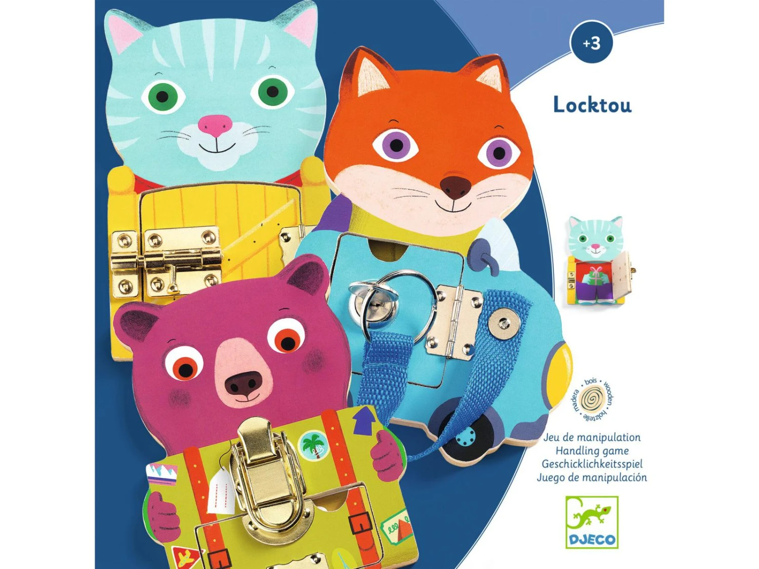 Un jeu de manipulation de trois mignons petits animaux en bois où l’enfant s’entraîne sur chacun d’entre eux à ouvrir et fermer des serrures. Dès 3 ans, Locktou accompagne les premiers apprentissages.
