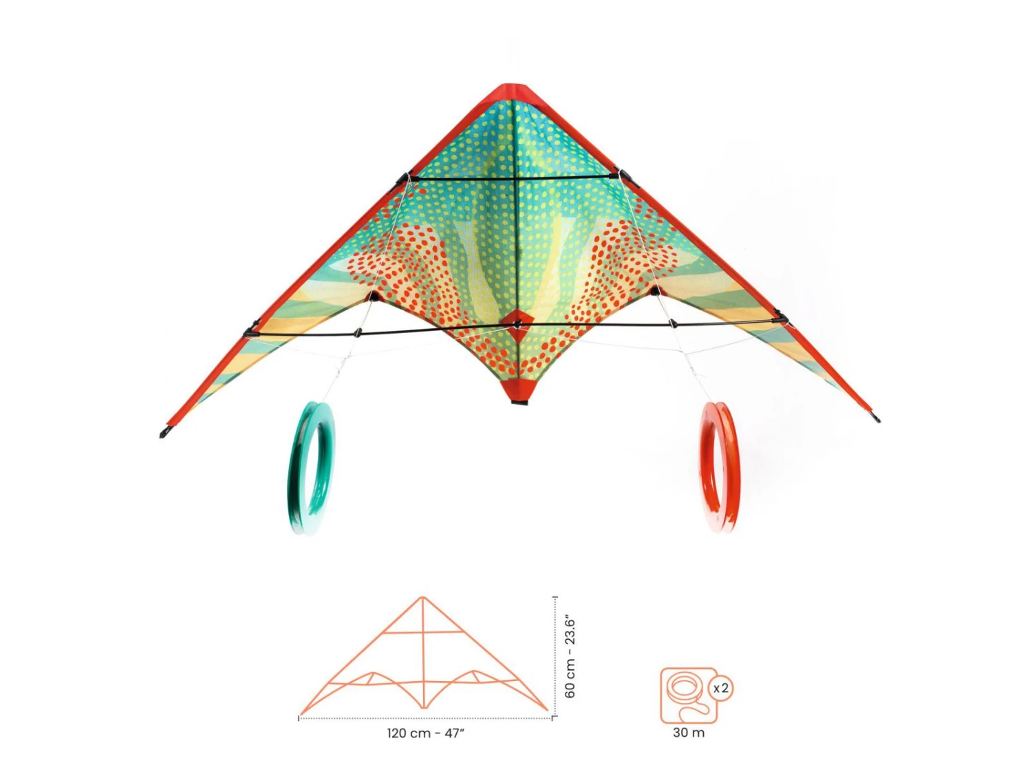 Red Dots est un cerf-volant pilotable grâce à ses 2 lignes. Il permet de s’initier au déplacement dans les airs et au plaisir de découvrir de premières figures acrobatiques. Dimension : 120 x 60 cm.