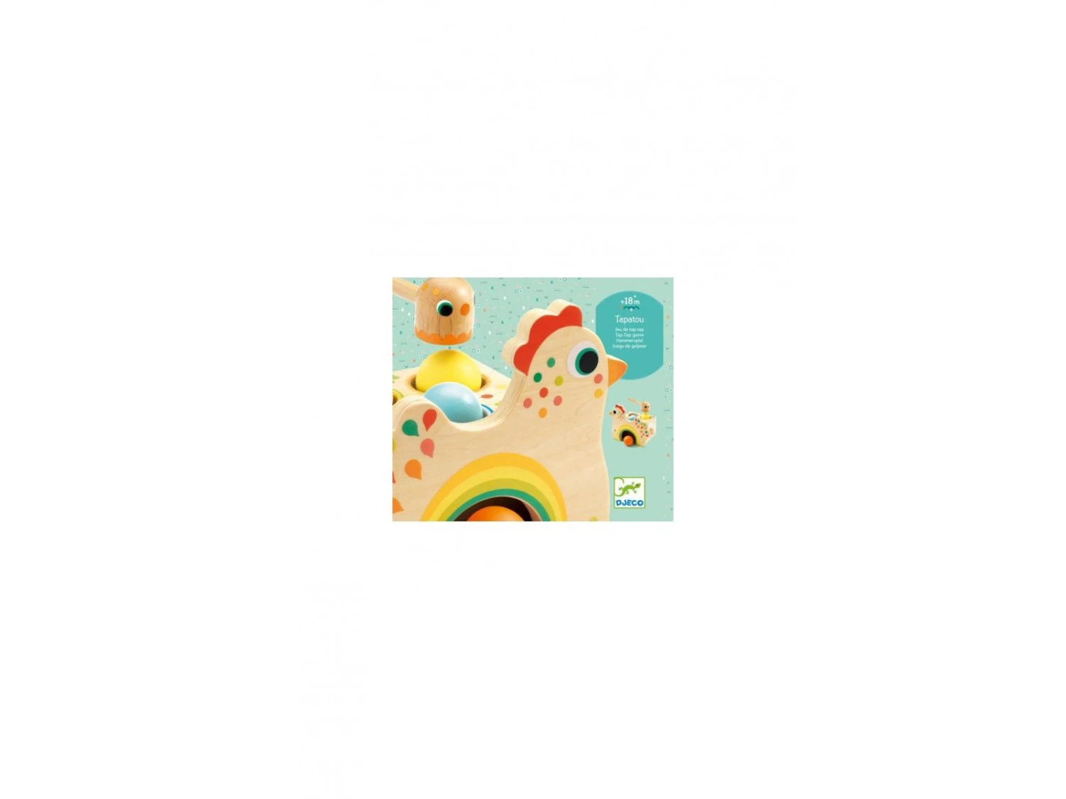 Un jeu de tap-tap en bois naturel et aux couleurs vives. Une jolie boîte en forme de poule sur laquelle l’enfant place les 3 boules colorées sur les trous et tape à l’aide du marteau pour les faire tomber.