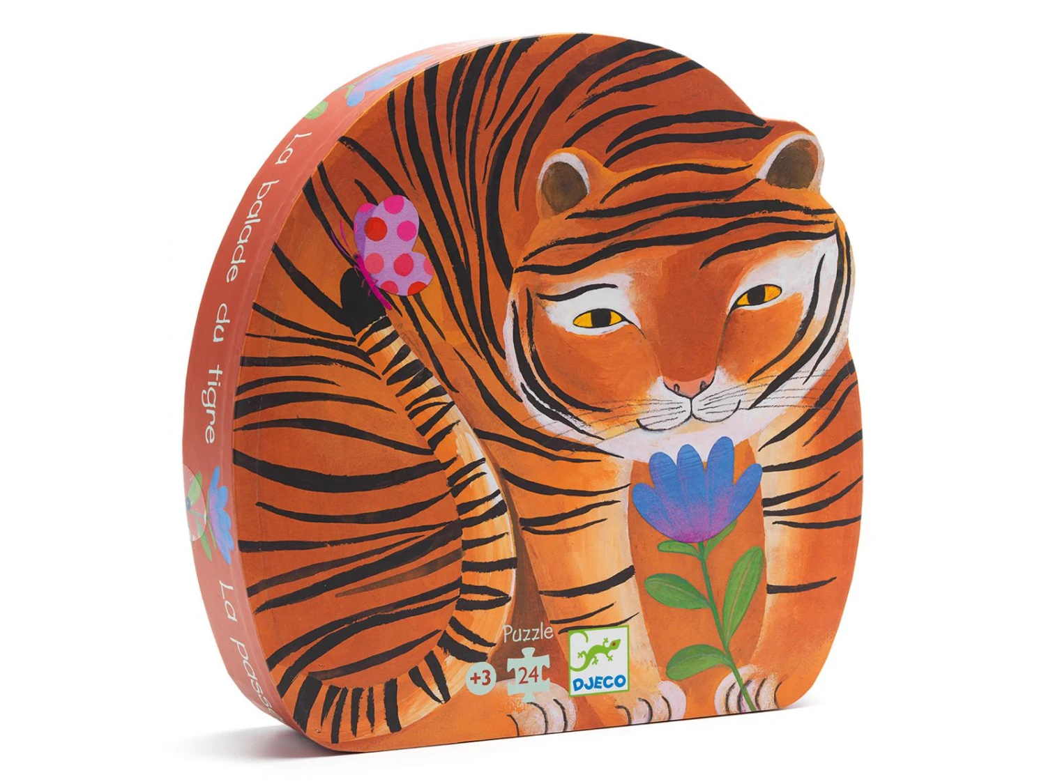Un tigre se promène dans la jungle… Un magnifique puzzle de 24 pièces dans une boîte élégante en forme de tigre.