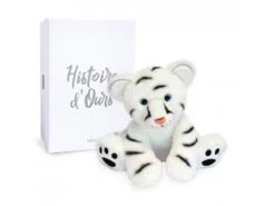 Ce bébé TIGRE BLANC, aussi appelé TIGRE BLANC ROYAL, est un magnifique tigreau au pelage blanc rayé de noir, au yeux bleux et au nez rose. Attendrissant avec sa bonne bouille et ses pattes généreuses, ce petit tigre assis est souple et très doux. Parfait pour faire des câlins, pour jouer ou en déco, il est présenté dans un jolie boîte. C’est un cadeau idéal dès la naissance. Lavage à 30°, séchage naturel ou mécanique à basse température.