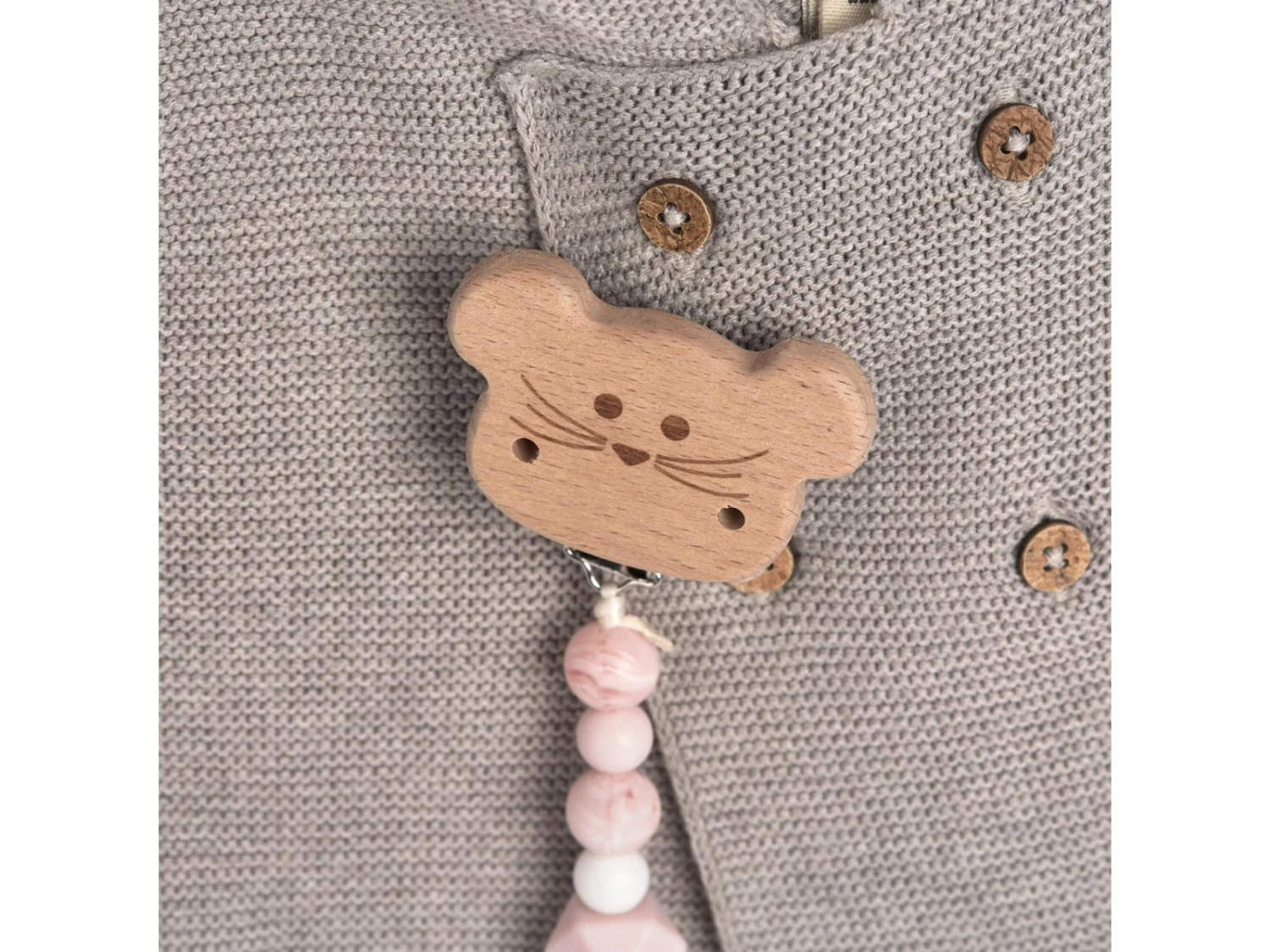 L’attache-sucette sans BPA est composé d’un clip en bois représentant une des mignonnes figurines de la collection Little Chums : chien, chat ou souris, avec une fermeture métallique, ainsi que d’une chaîne en silicone multicolore et d’un anneau en silicone pour attacher la sucette.