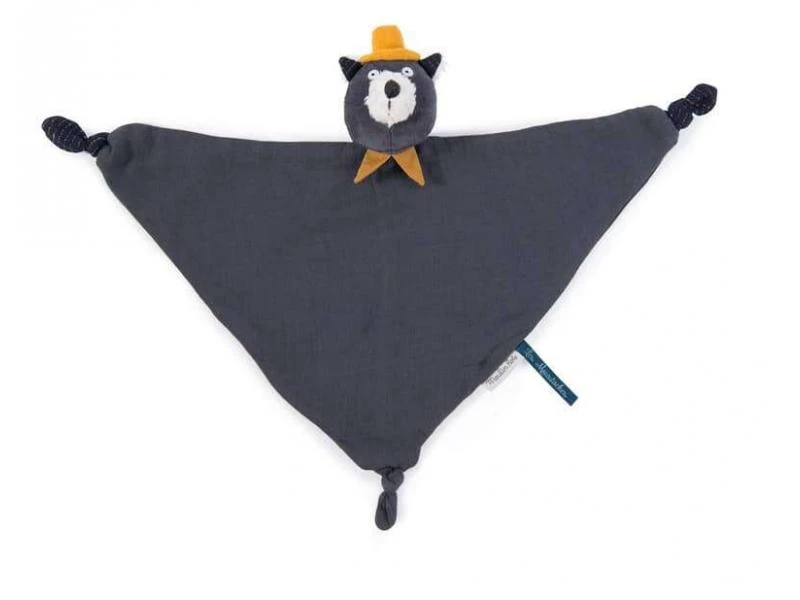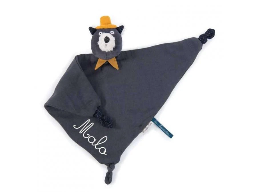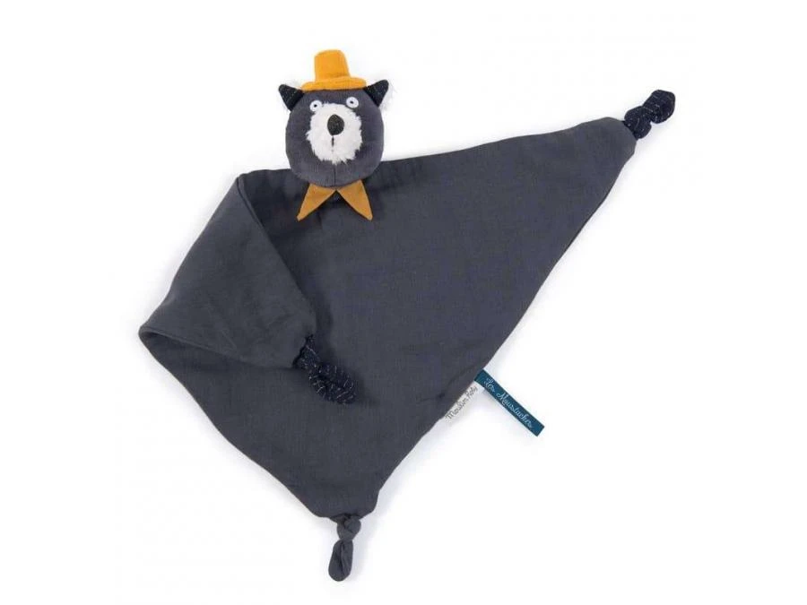 Doudou Alphonse le chat en tissu lange gris foncé, toujours classe avec son chapeau ! Noué à chaque coin, ce doudou plat est facile à saisir par les petites mains de bébé. Il peut être brodé au prénom de l’enfant. Idéal pour un cadeau naissance.