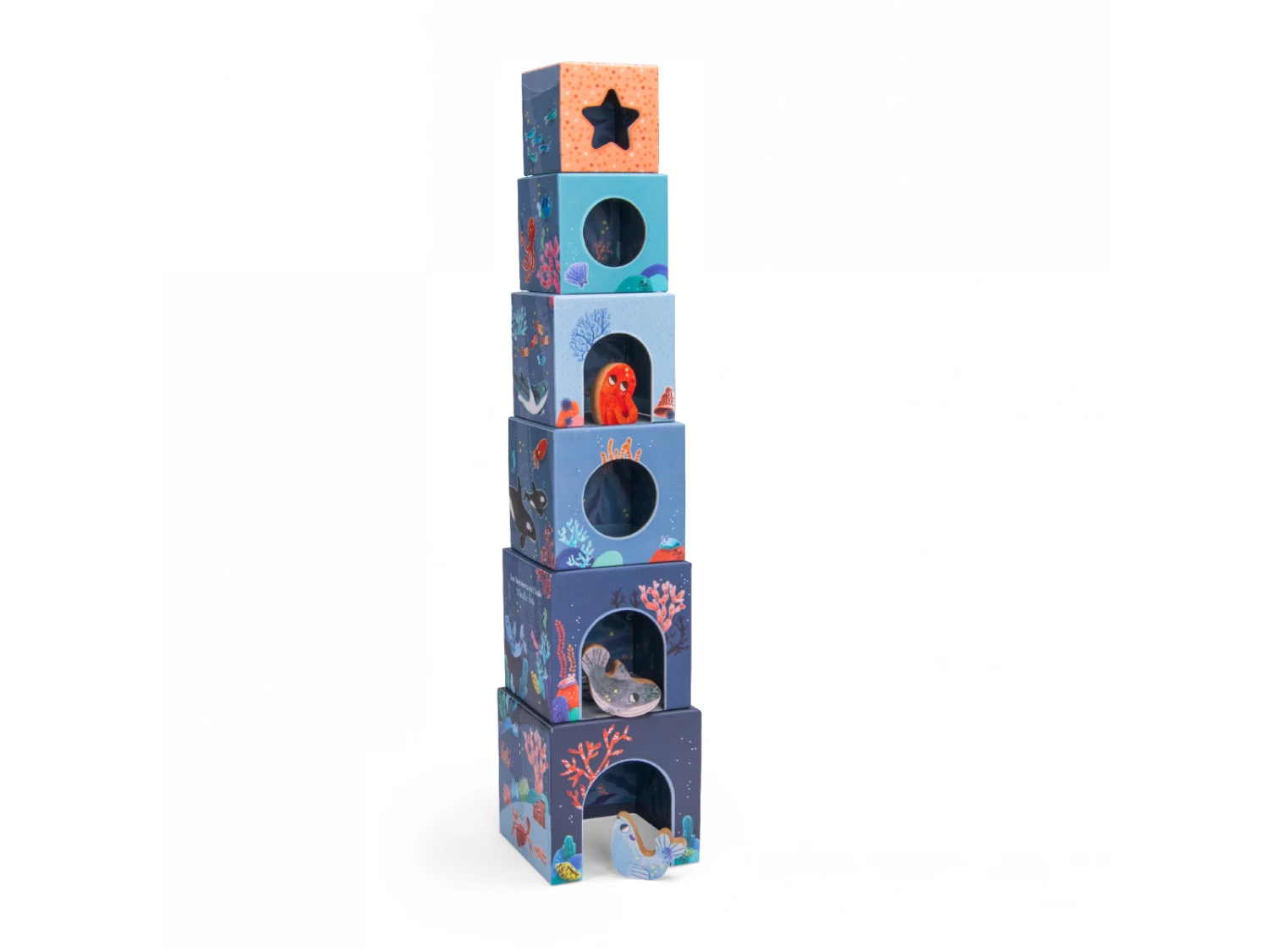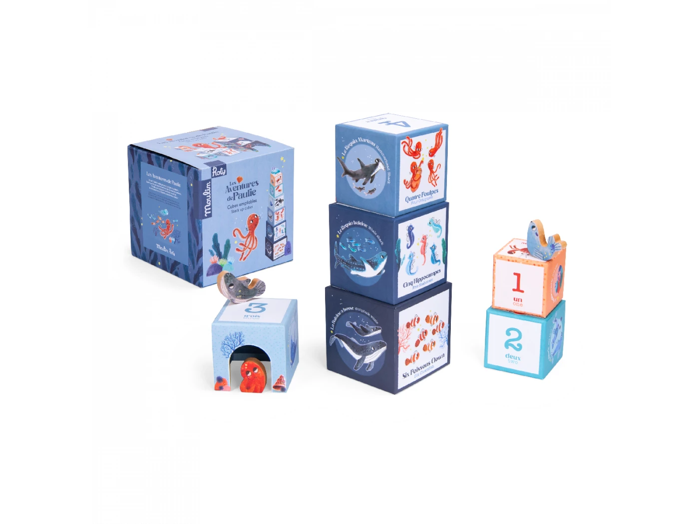 6 cubes empilables avec 3 personnages en bois invitent bébé à jouer jusque sous l’océan. Leurs faces joliment illustrées permettent différents apprentissages pour s’amuser selon l’âge : créer une tour, apprendre à compter, découvrir les animaux marins…