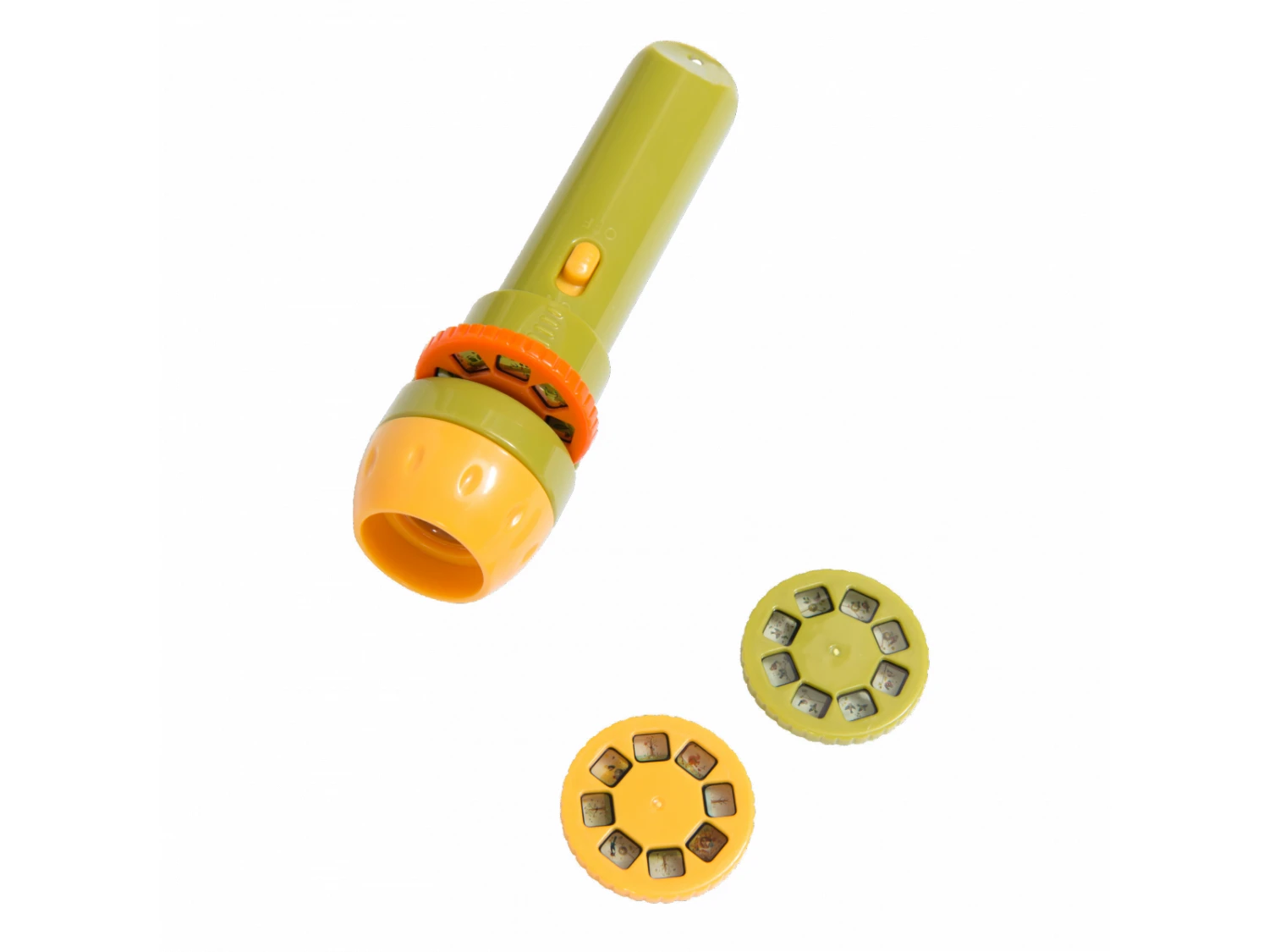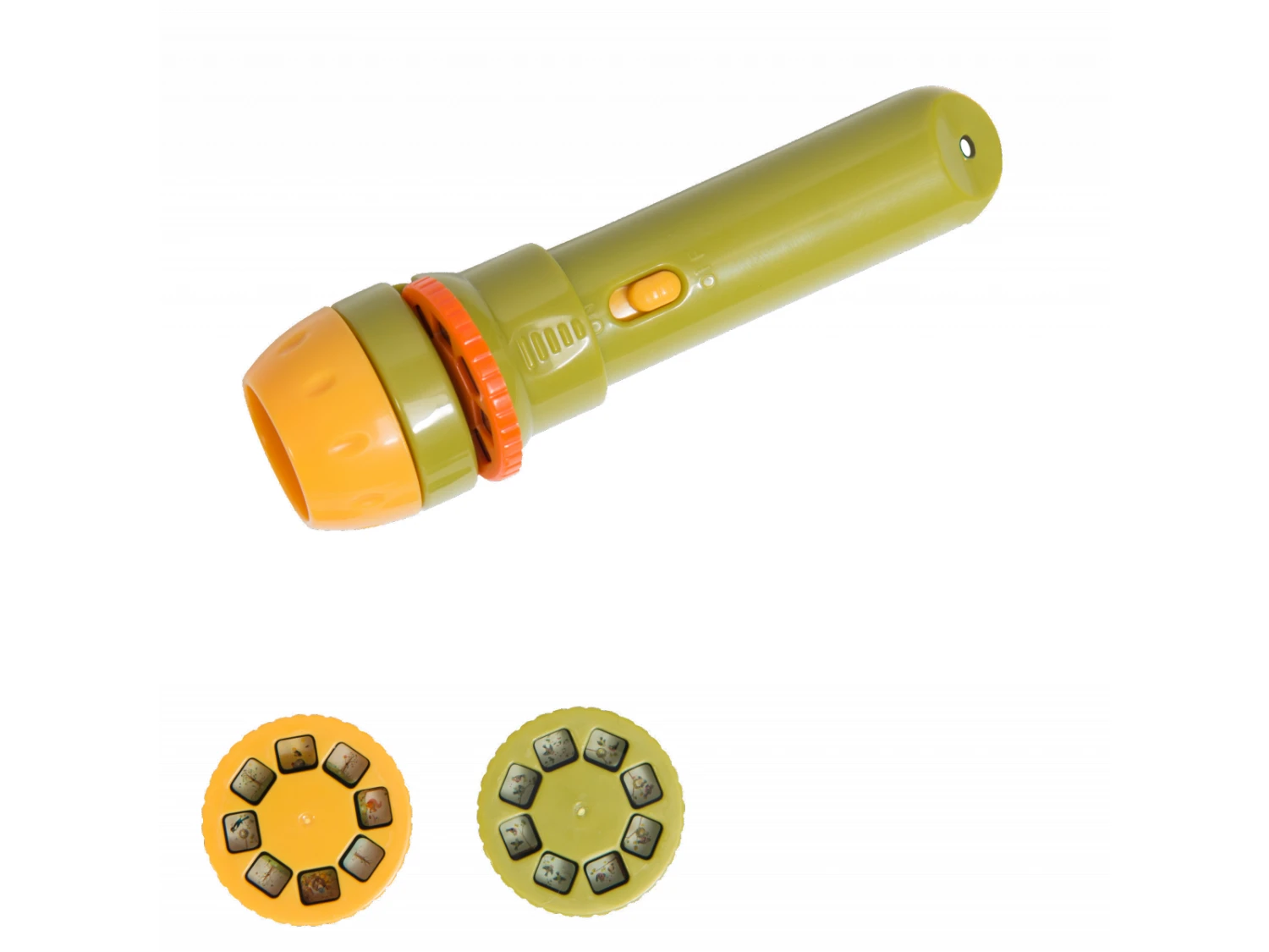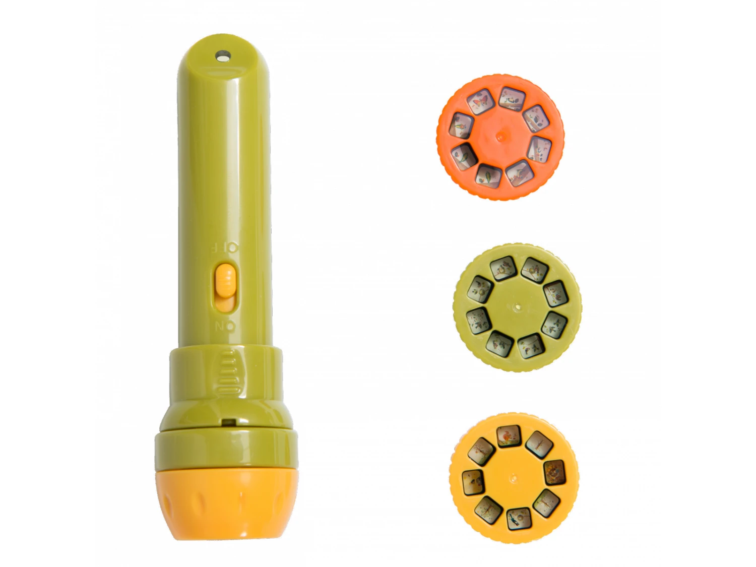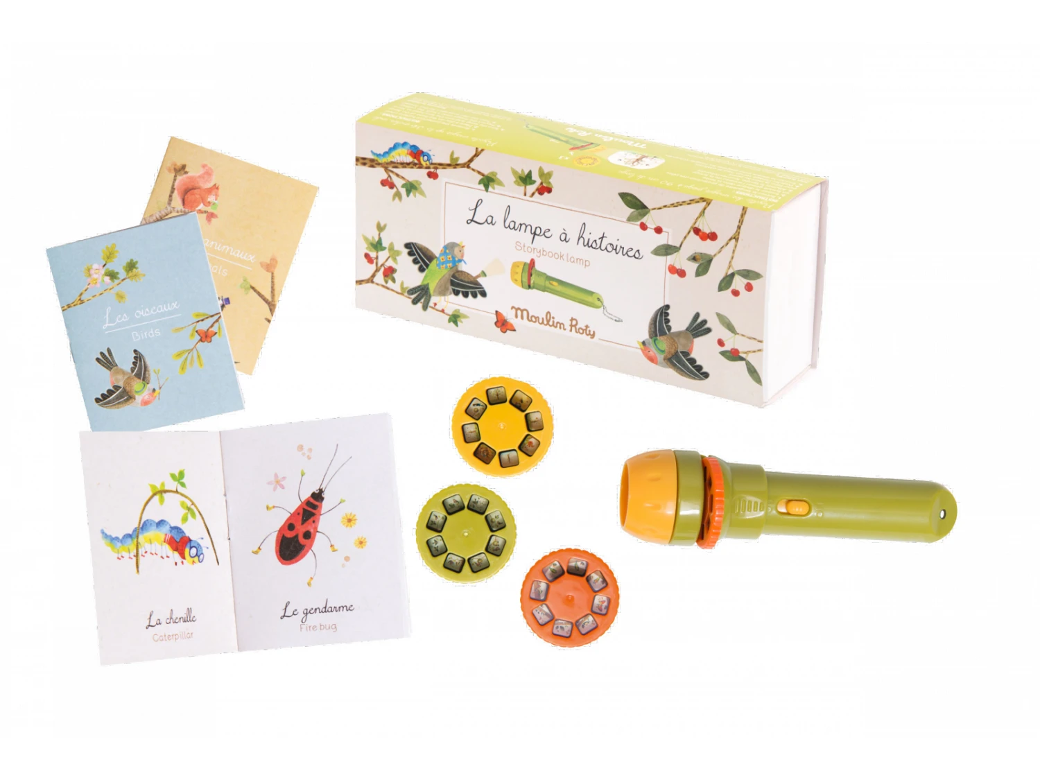 Lampe torche de poche comprenant trois disques à emboîter. Chacun des disques, projeté sur le mur raconte une histoire en couleurs sur les petits animaux du jardin du Moulin.